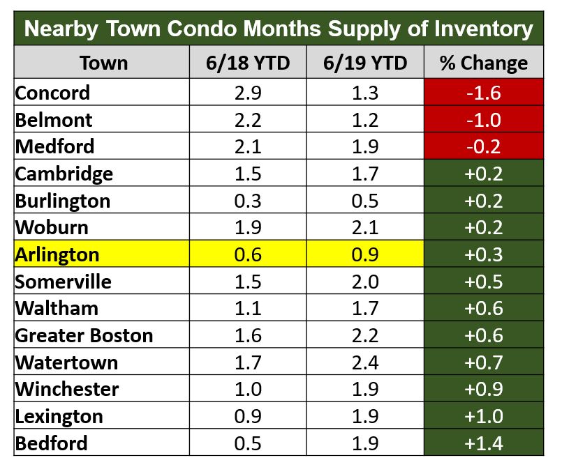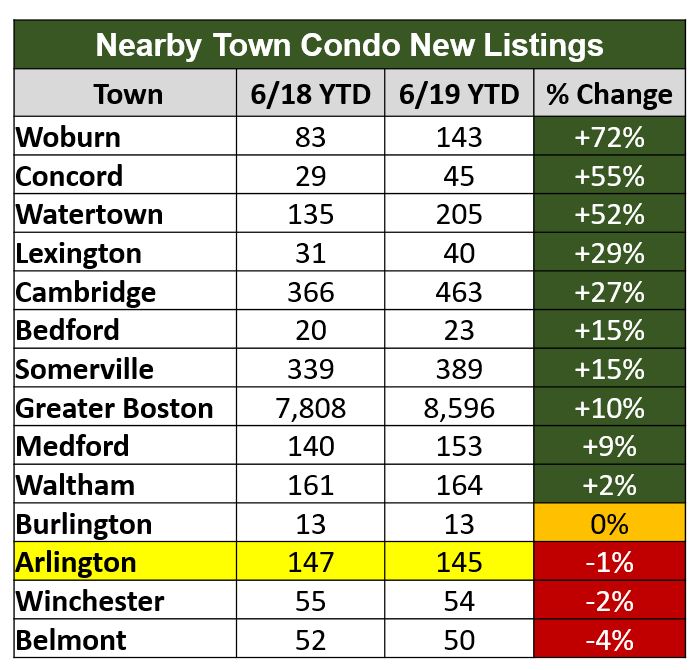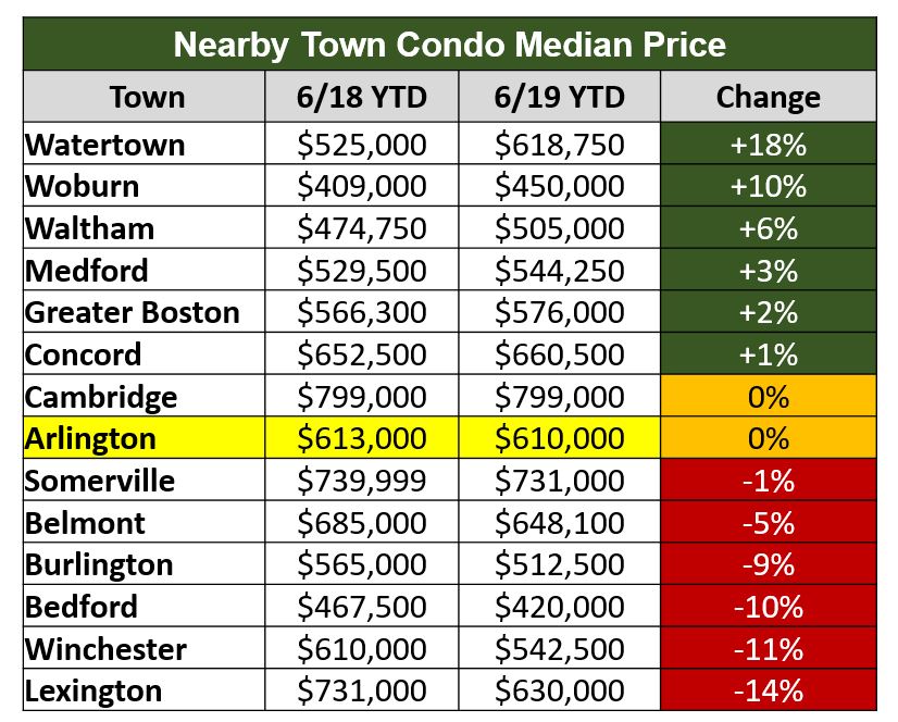 Arlington 2019 (June YTD) per square foot condo prices ($469/sq.ft.) were not as steep as those in Cambridge ($819/sq.ft.) or Somerville ($653/sq.ft.). And if Arlington prices are too high, buyers may want to consider alternatives such as Winchester where the 2019 (June YTD) median price ($542,500) was 11% than in Arlington ($610,000), Medford ($544,250) where it was also 11% less, Burlington ($512,500) where it was 16% less, Waltham ($505,000) where it was 17% less, Woburn ($450,000) where it was 26% less, or Bedford ($420,000) where it was 31% less.