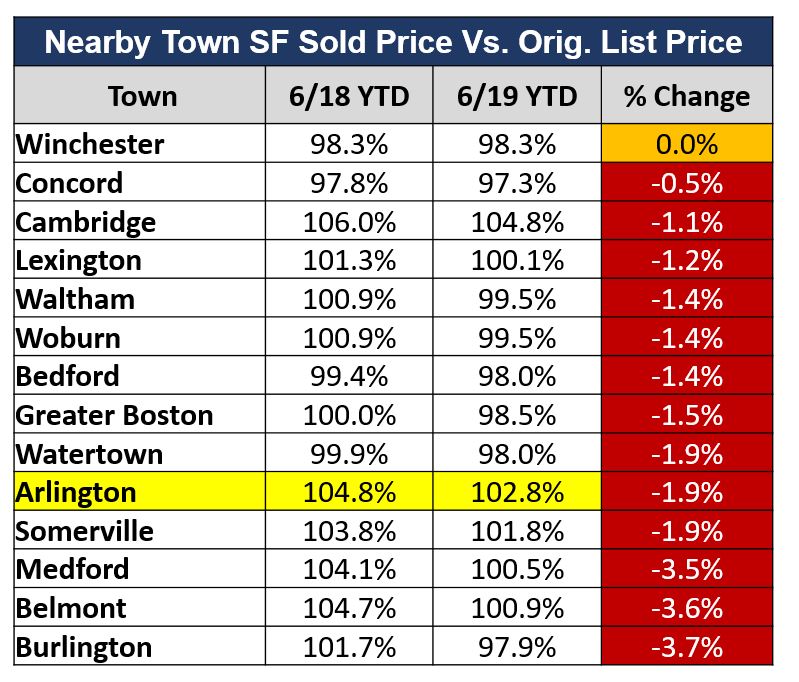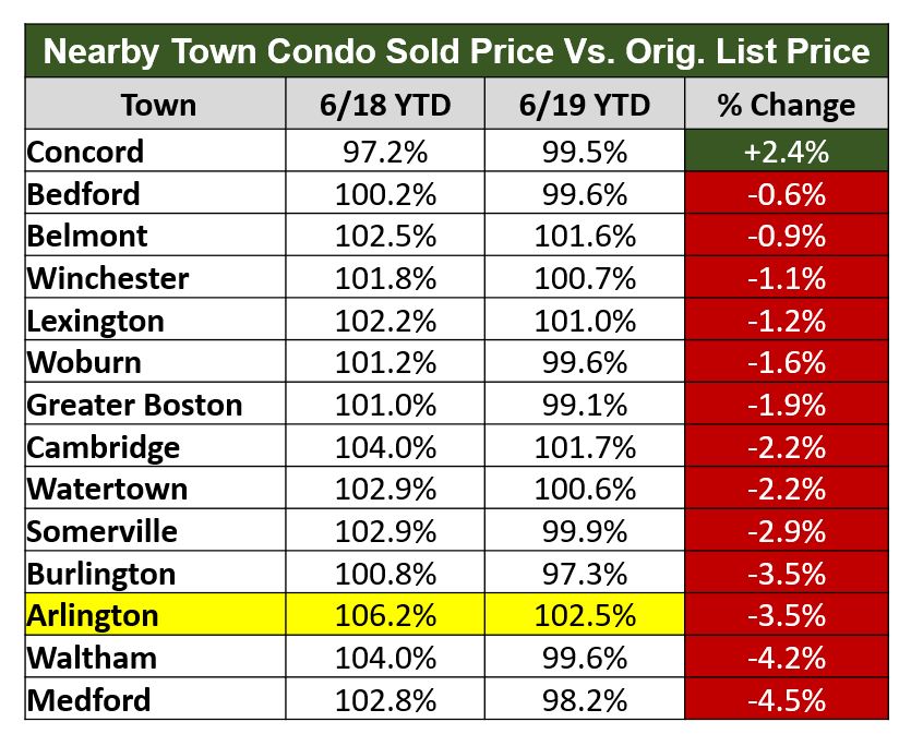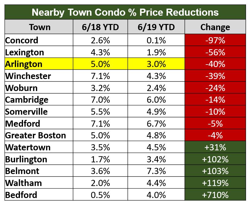 Arlington single-family homes, with average price reductions of 5.0% in June 2019 YTD, did not require the same level of price reduction to get sold as did homes in the greater Boston area (6.8%), or in nearby towns such as Cambridge (9.2%), Medford (6.9%), Lexington (6.3%), or Winchester (6.3%). Similarly, the average price reduction needed to get Arlington condos sold (3.0%) was less than the reduction needed in the greater Boston area (4.8%) or in nearby towns such as Belmont (7.3%), Medford (6.7%), Cambridge (6.0%), or Winchester (4.3%).