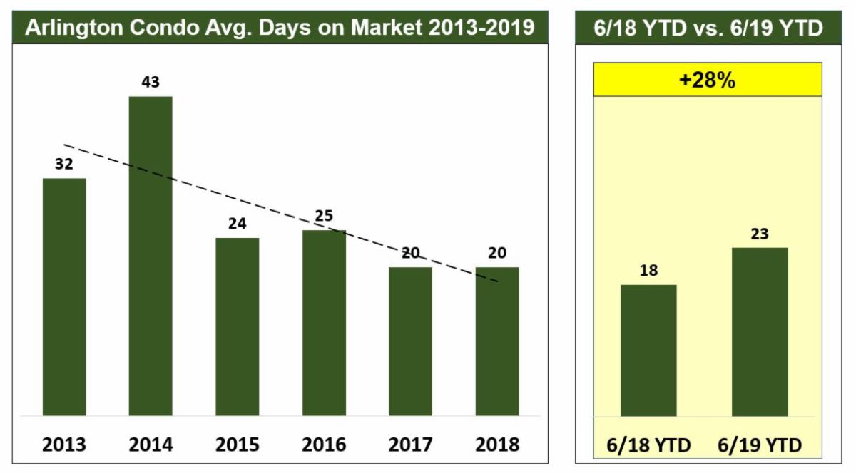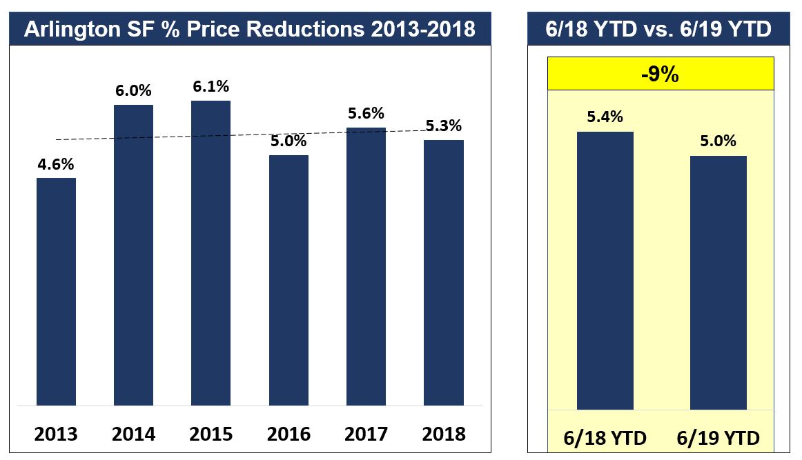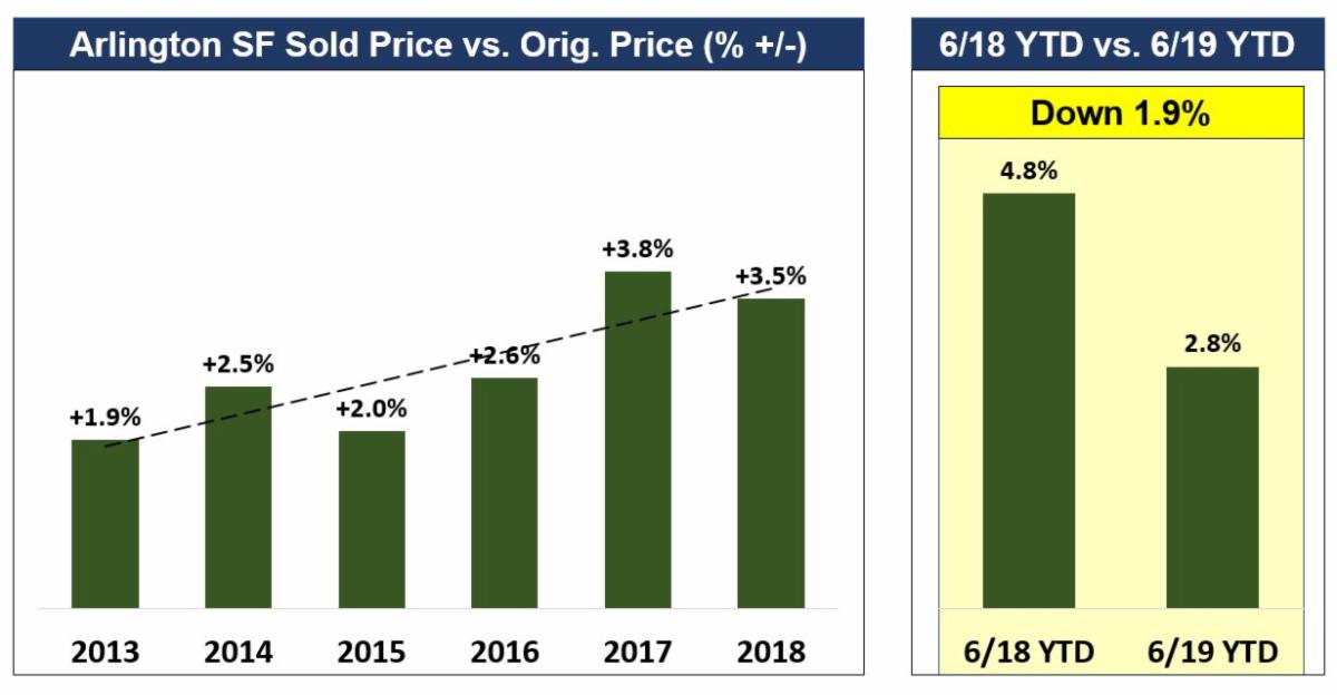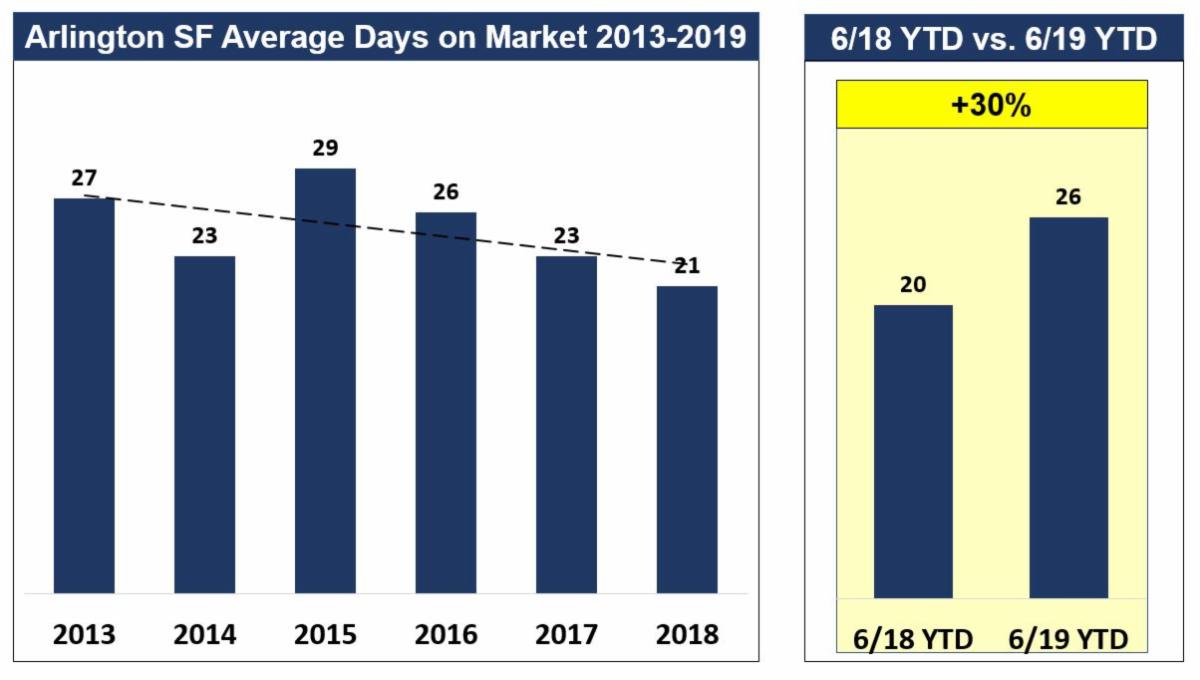 Through June 2019 Arlington single-family and condo days on market both increased versus the same period last year (26 DOM vs. 20 DOM for single-family homes, and 23 DOM vs. 18 DOM for condos). On the surface, this would appear to be is a clear sign of some softening of demand.