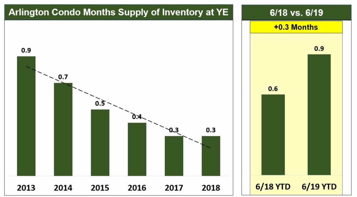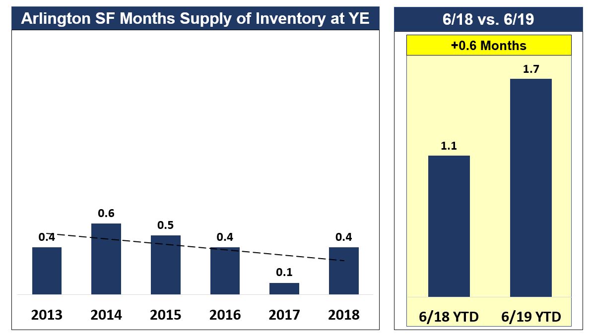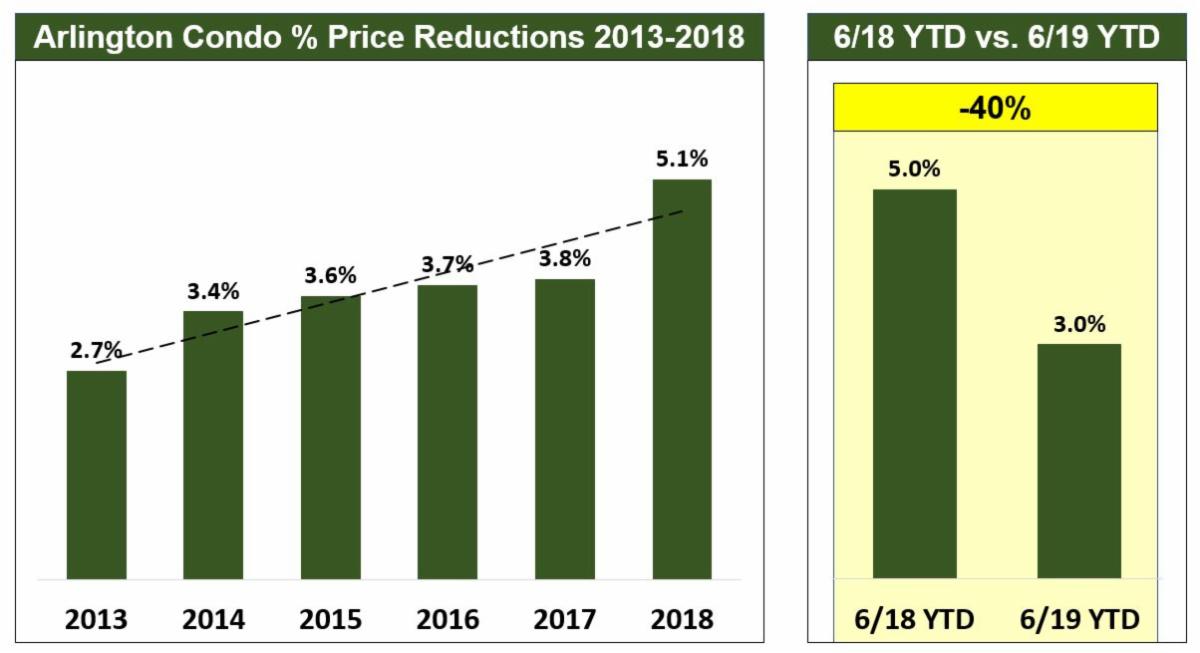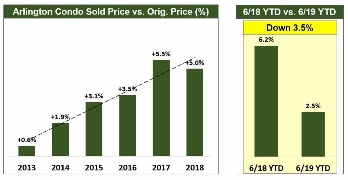 Through June 2019 Arlington single-family and condo days on market both increased versus the same period last year (26 DOM vs. 20 DOM for single-family homes, and 23 DOM vs. 18 DOM for condos). On the surface, this would appear to be is a clear sign of some softening of demand.