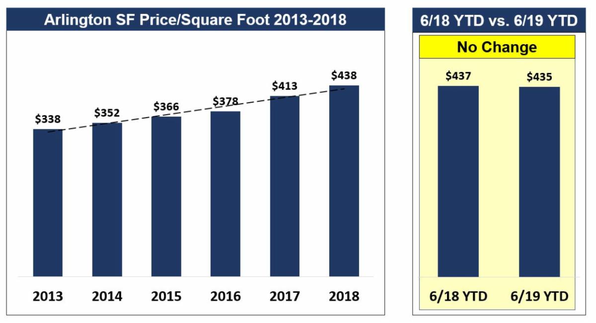 Per square foot prices in 2019 through June for both Arlington single-family homes and condos were essentially flat versus the same period in 2018. This tracks closely to the situation for median prices, underscoring the conclusion that the Arlington market has leveled off.