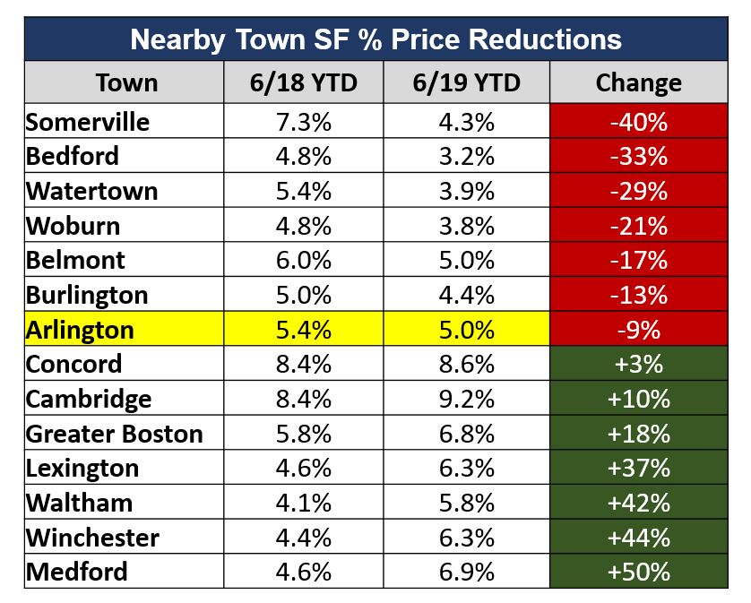 And yet in several of these nearby communities the price reduction needed to get single-family homes sold decreased to a greater degree than in Arlington, suggesting a greater growth in buyer demand in those towns than in Arlington. We can conclude that while buyer demand in Arlington remained strong, year over year, demand in some nearby communities was on its way to catching up.