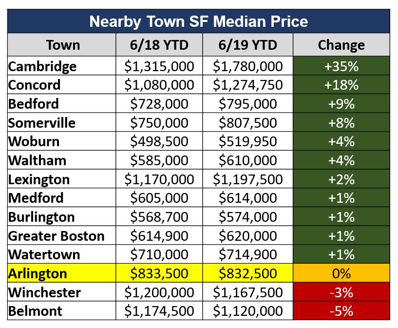 And if Arlington prices are too high, buyers may want to consider other nearby towns. In the first half of 2019 the median single-family home price in Bedford ($795,000) was 5% less than that in Arlington ($832,500), in Watertown ($714,900) it was 14% less, in Medford ($614,000) it was 26% less, in Waltham ($610,000) it was 27% less, in Burlington ($574,000) it was 31% less, and in Woburn ($519,950) it was 38% less.