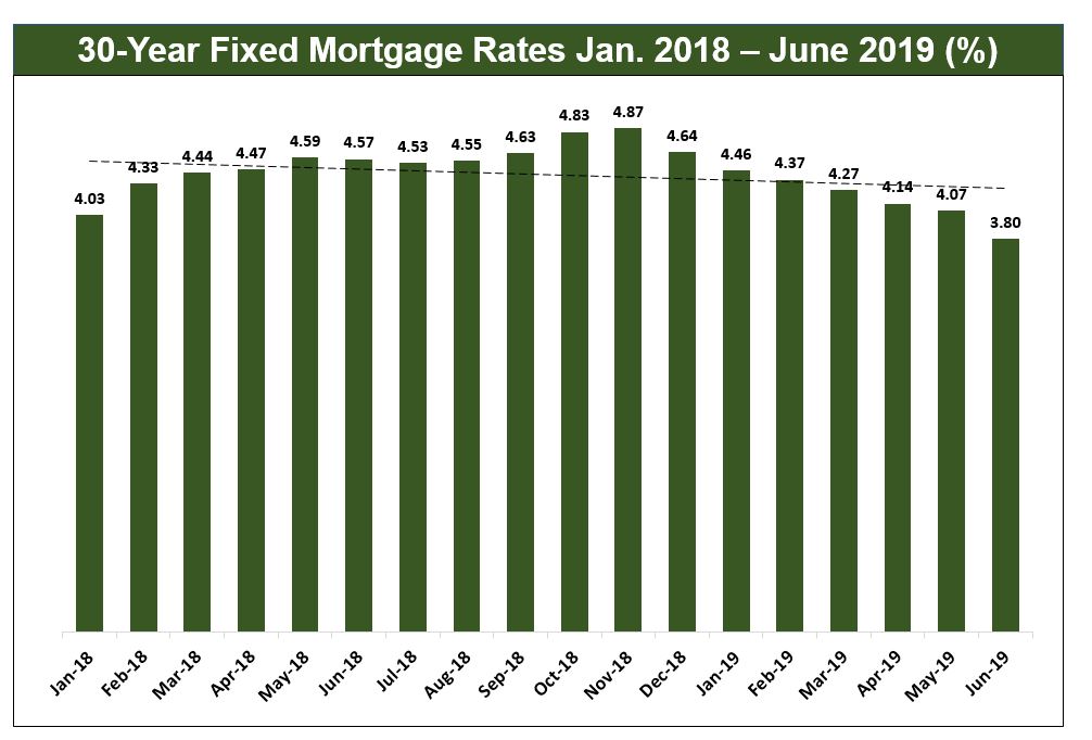 Mortgage rates went down in the first half of 2019, hitting 3.8% for 30-year fixed mortgages at the end of June. This followed on the heels of rising rates throughout most of 2018, when rates peaked at about 4.9%, causing some to conclude that the real estate market would cool of significantly. But with rates coming down again in 2019, homes became more affordable, offsetting the headwinds caused by rising supply and falling demand. Even if the homes were priced just as high as before, buyers were out of pocket a little less each month when it came time to pay the mortgage.