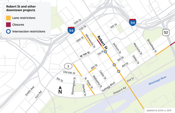 - Parking and sidewalk restrictions will be in place between Minnesota and Robert streets. Please pay extra attention to signage and follow any posted pedestrian routes.