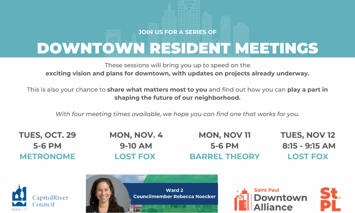 Before heading out for the weekend, I also want to remind you that Councilmember Noecker, the CapitolRiver Council, and the Downtown Alliance are co-hosting a series of informational meetings for downtown residents and community members, beginning this Tuesday evening at 5 p.m. at MetroNOME. Additional details, along with the rest of the dates, can be found below.