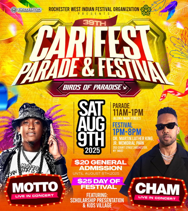 The Rochester West Indian Festival Organization presents the 39th annual Carifest. The parade will make its way through downtown Rochester, NY, starting at W Main St and Plymouth Ave, followed by the festival at the Martin Luther King Jr. Memorial Park.