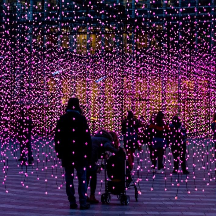 Submergence is a large, immersive, walk-through experience of light by the U.K.’s art collective Squidsoup, pioneers in the use of light, sound, and technology. Dynamic, three-dimensional movements create a swirling, sensory experience.