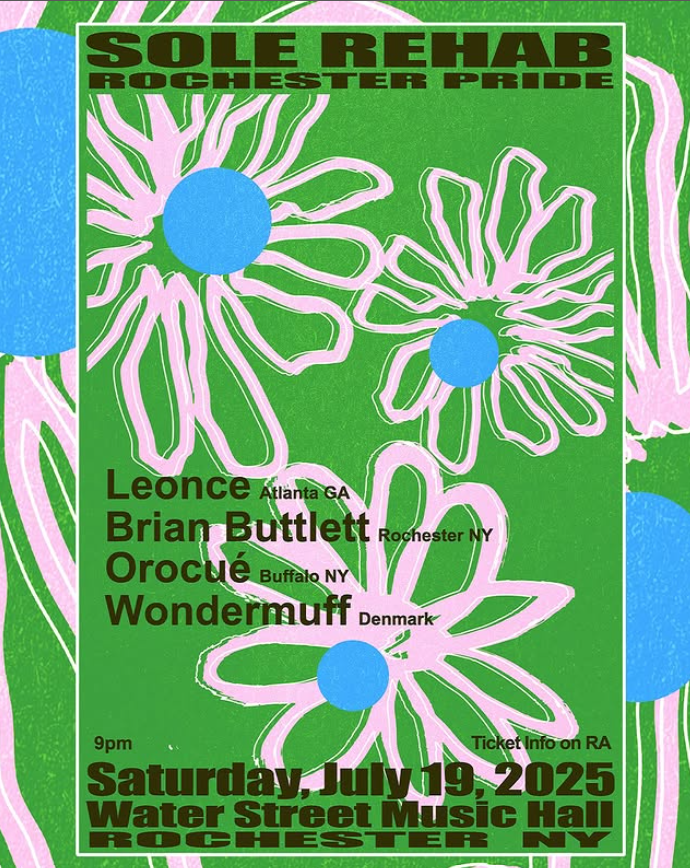 Sole Rehab is thrilled to announce that Leonce, Wondermuff, Orocué, and Brian Buttlett will be performing for Rochester Pride. Founded in 2015, Sole Rehab is a Rochester based DJ collective dedicated to supporting the queer underground dance music scene in Western New York. Purchase tickets here.
