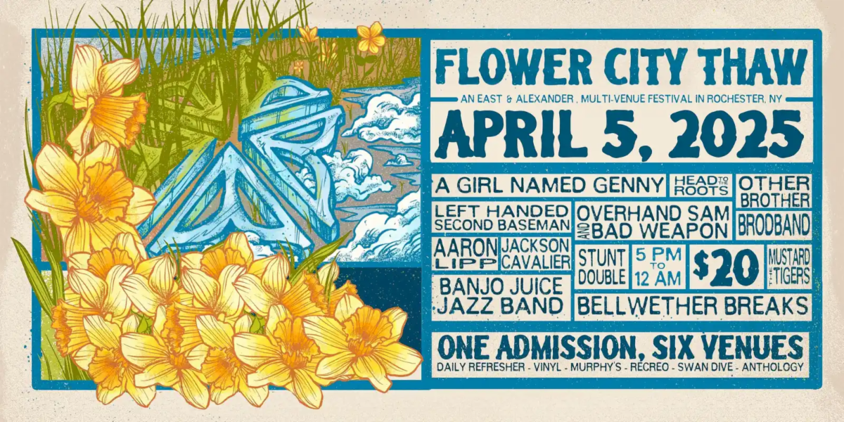 The Flower City Thaw is a multi-venue music festival taking over Rochester's East and Alexander entertainment district on Saturday, April 5. With shows starting every 30 minutes across six venues, attendees can enjoy performances by over 13 bands throughout the evening.