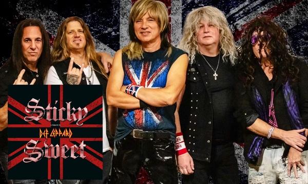 Before a blazing backdrop of fiery reds and electric logos, the Def Leppard tribute band “Sticky Sweet” stands as a testament to rock ‘n’ roll legend.