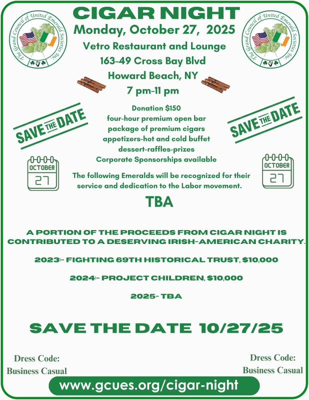 | | | The Sound Shore St. Patrick’s Day Parade was held on Saturday, March 29, 2025, in Mamaroneck, New York. The Grand Marshal was our esteemed friend, NYPD Emerald Matthew McCauley. The parade was dedicated to all the 9/11 First Responders, including those who are currently ill or have passed away due to illnesses related to their work in the rescue and recovery efforts following the September 11, 2001, terrorist attacks. | | On Saturday, March 29, 2025, the Bayside Parade was held in Queens, New York. Grand Marshal Tony Jackson led the parade, with assistance from GCUES Aide Glenn F. Lynch (NYPD ES). The NYPD ES held its annual post-parade reception at Monahan & Fitzgerald Restaurant. | | Ireland Great Hunger Museum Founders Gala | |