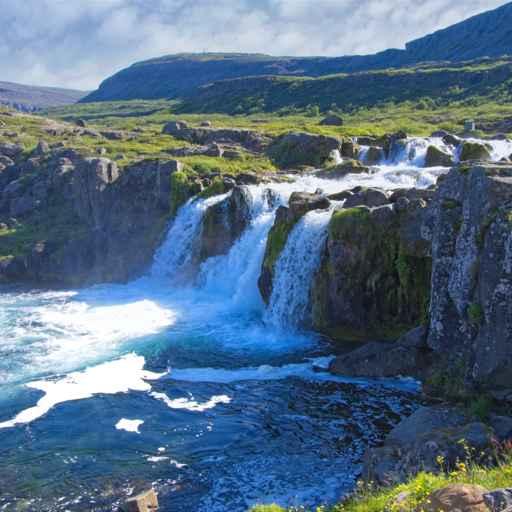 Dynjandi, often referred to as the "Jewel of the Westfjords," is a breathtaking waterfall located in the remote Westfjords region of Iceland. The waterfall is a series of seven cascades that collectively span over 100 meters in height, with the largest and most impressive, Dynjandi itself, resembling a bridal veil due to its unique fan shape. The waterfall's name translates to "thunderous" or "resounding," a fitting description for the powerful roar that can be heard as the water tumbles down the rugged cliff face. The surrounding landscape is equally captivating, with lush greenery, rugged cliffs, and the serene fjord providing a stunning backdrop. A visit to Dynjandi is a journey into the heart of Iceland's raw, untouched beauty, offering a tranquil retreat from the hustle and bustle of modern life. | |