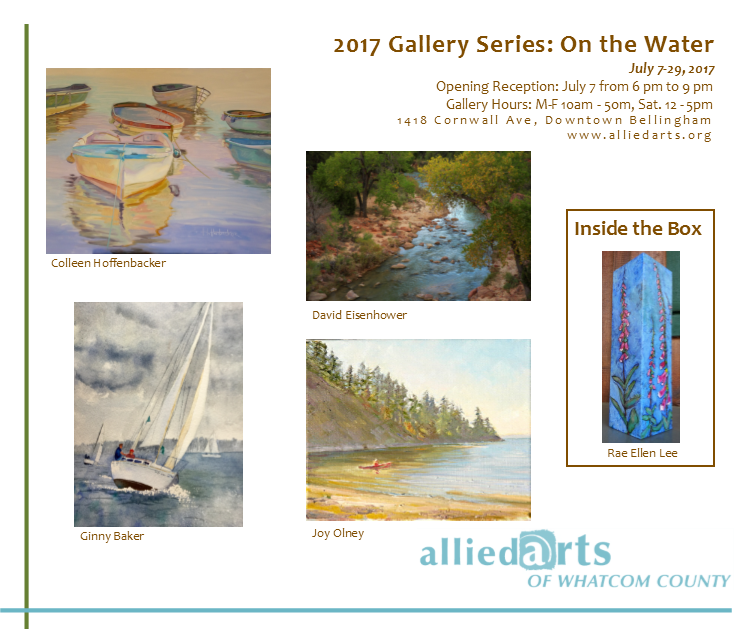 On the Water. This show features beautiful pieces by David Eisenhower, Ginny Baker, Colleen Hoffenbacker and Joy Olney. Works displayed express each artists’ love of water and the roles it plays in recreation, industry and nature. In addition to works of and about water, our Inside the Box artist will be Rae Ellen Lee with miniature window sill paintings.