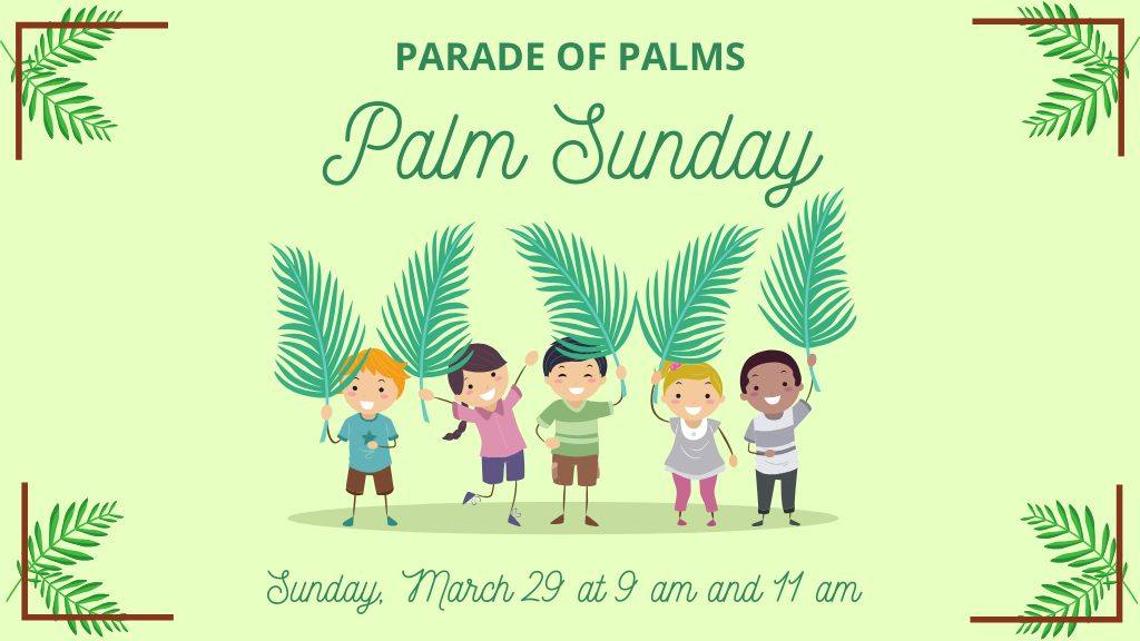 All kids are invited to help us celebrate Palm Sunday with a parade of palms at both the 9 am and 11 am services on Sunday, March 29. Kids will process around the sanctuary shouting hosanna and waving palm branches.