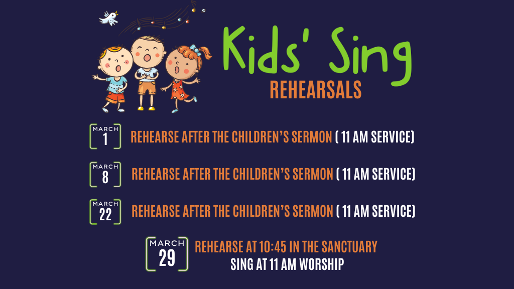 Our next Kids Sing is coming!! Rehearsals begin Sunday, March 1. Kids will be dimissed from the 11 am service to rehearse with Ms. Alicia Wolff.