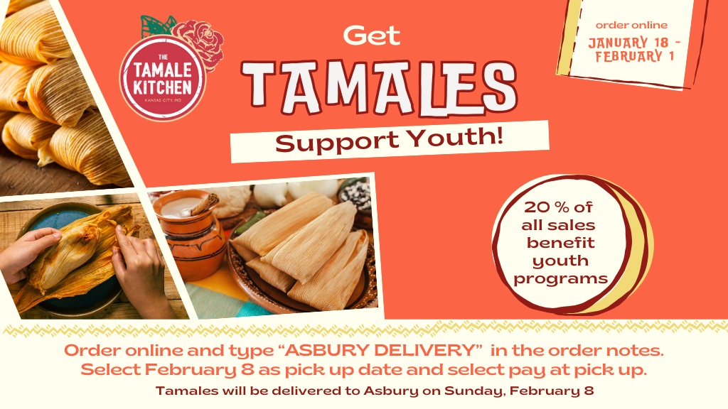 Tamales will be delivered to Asbury on Sunday, February 8 and will be available for pick up from 10 am - 12 pm. Tamales are frozen fresh and come with reheating instructions.