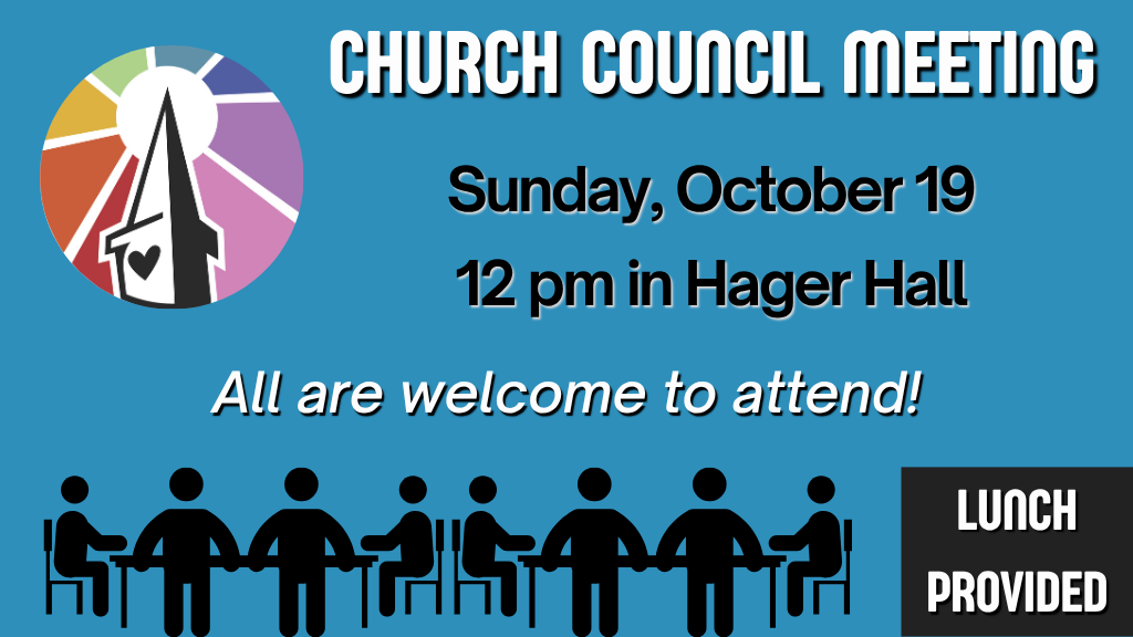 Our next Church Council meeting will be held on Sunday, October 19 after the 11 am service in Hager Hall. Lunch will be provided, and all are welcome to attend!