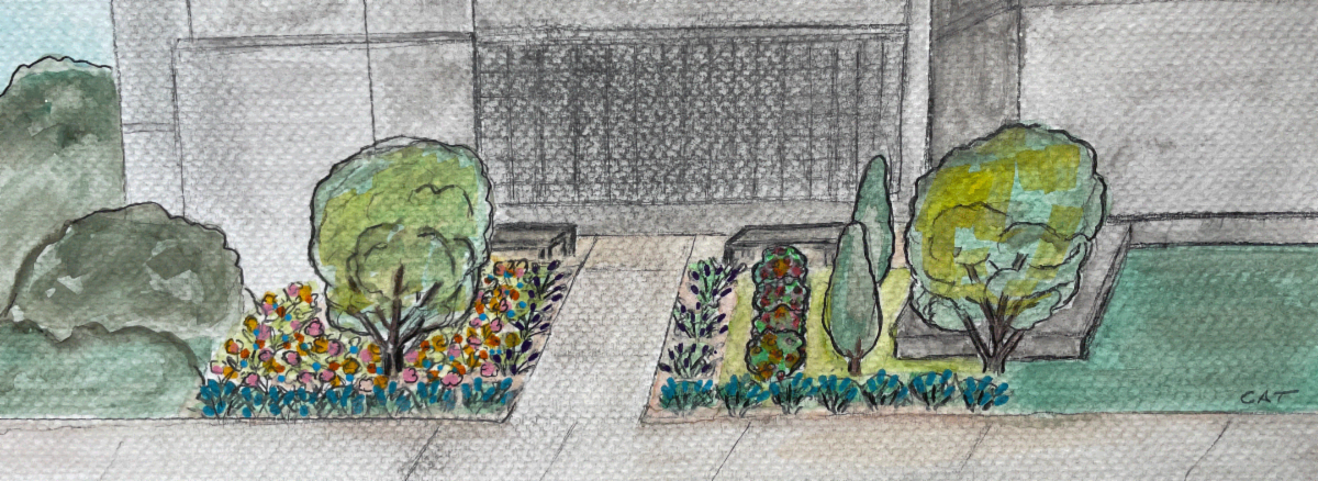 watercolor painting of the planned Memorial Garden and Columbarium by Cheryl Thompson