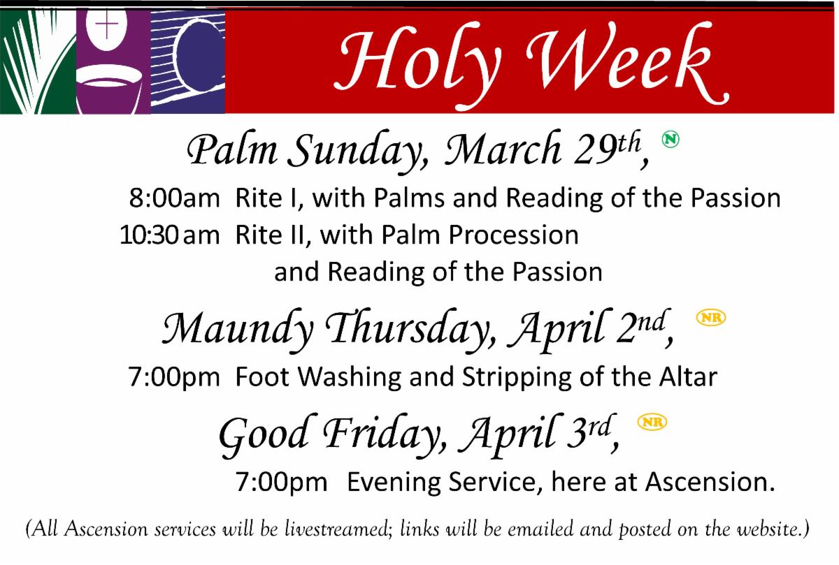 Please make an offering to help underwrite the Easter Musicians. They were wonderful at Christmas and we look forward to a repeat performance. Donations may be dedicated in memory of, in honor of, in thanksgiving for, etc., and will be acknowledged in the Easter orders of service. Donations will be accepted through Easter, but in order for the dedication to appear in the bulletin, it must be received by the office no later than March 30th. Please email the church office (office@ascensionepiscopalchurch.org).