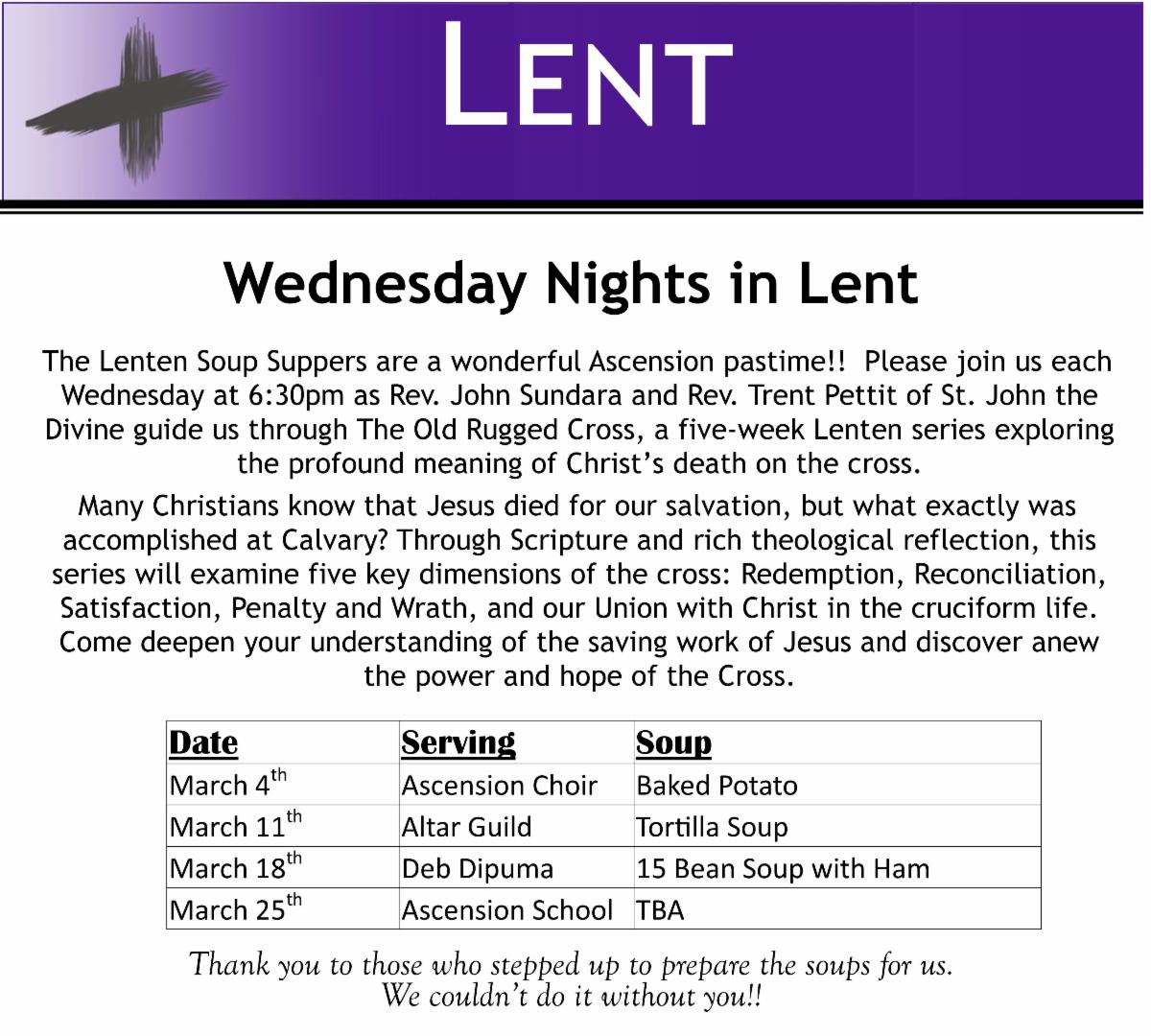 The Tuesday Bible Study is taking a hiatus for the season of lent. All participants are invited and encouraged to attend the Lenten Soup Supper and lessons at 6:30pm on each Wednesday of Lent.