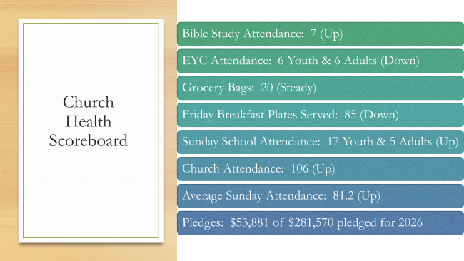 If you added someone to the "Prayers of the People" during our worship service please follow up with a phone call to the office and we will add them to next Sunday's prayer list. Also, let us know how the person you requested prayer for is doing.