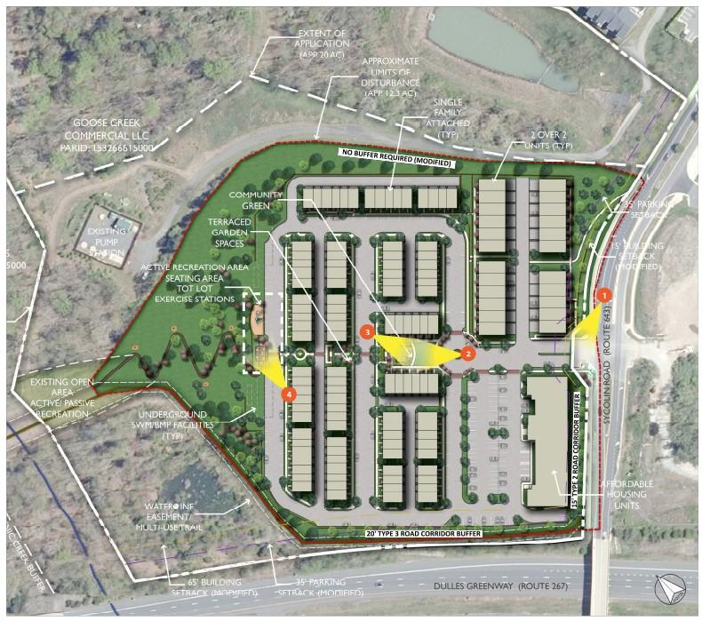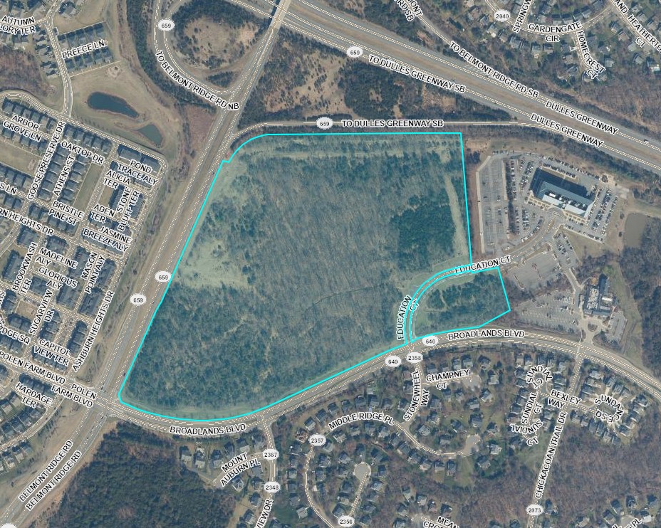 Description: “Goose Creek Village West” is a proposed application to rezone 20 acres (revised from 25 acres) to allow for the construction of an additional 222 residential units. These include 104 single-family attached units, and 46 multi-family stacked units, and 72 multi-family attached units. The residents are currently zoned to Belmont Station Elementary School, Trailside Middle School, and Stone Bridge High School.