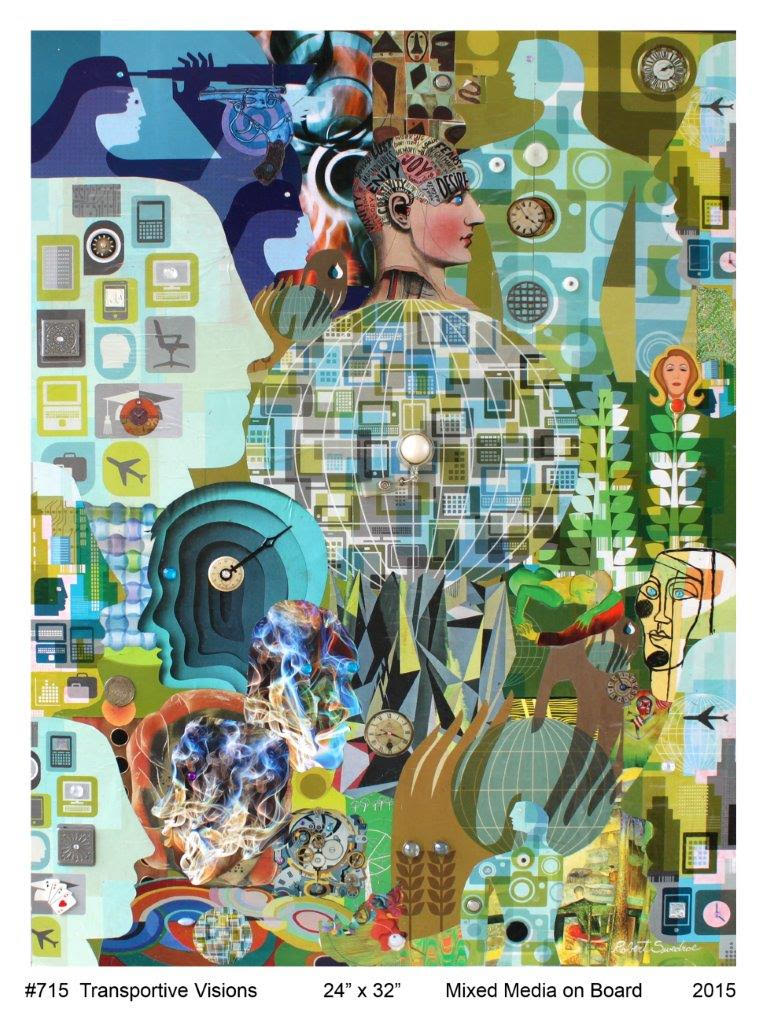 Miami Beach-based architect and artist Robert Swedroe makes use of computer technology, paint, fabric, cut paper, and all manner of found objects to create large- and small-scale dimensional collages and assemblages.