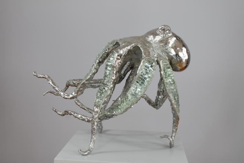 His bronze castings, using the lost-wax process are enhanced with variations of glass, aluminum and silver.