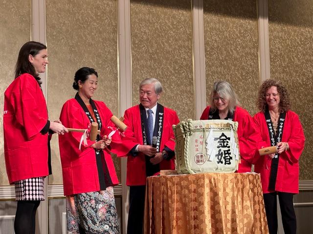Above: An auspicious occasion in Japan isn’t without Kagami Biraki and the breaking of a sake barrel to celebrate good health, fortune and 150 more years of MIT and Japan relations. | |