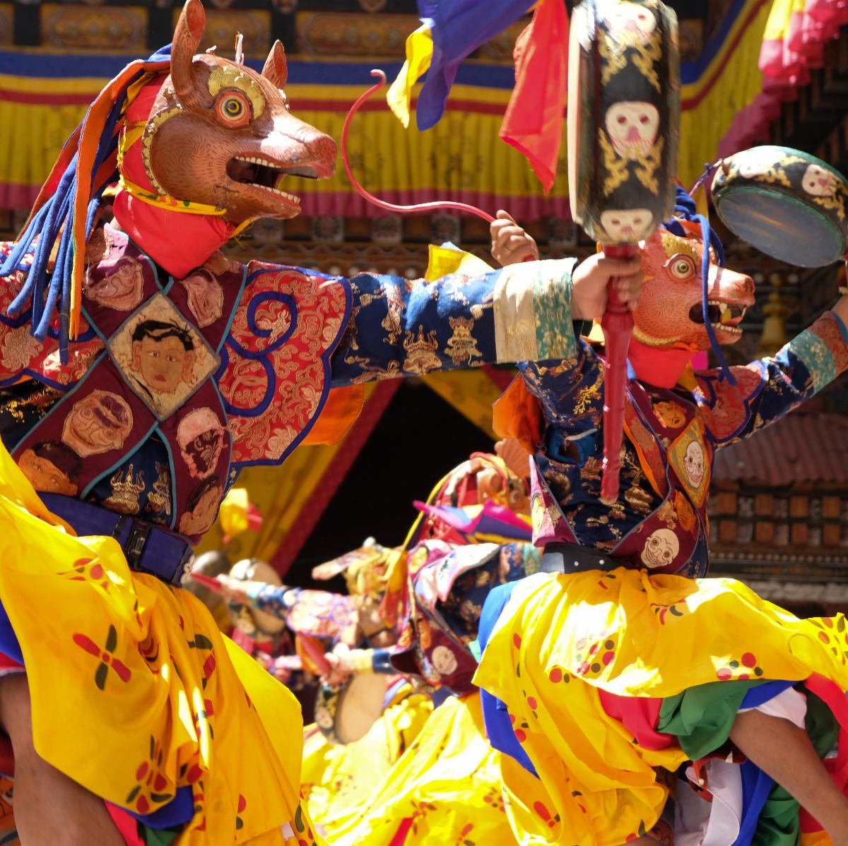 - Masked dancers representing deities and demons — each mask tells a story from Bhutanese Buddhist mythology.