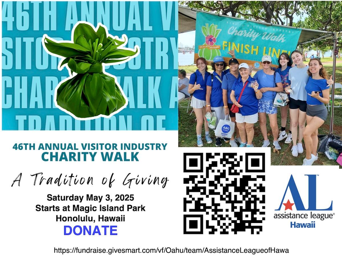 | | Transforming Lives - Strengthening Community | | Assistance League of Hawaii is participating in the 2025 Visitor Industry Charity Walk, starting at Magic Island on Saturday, May 3. Scan the QR code or click on the graphic above to go to the Charity Walk Donation Page for Assistance League of Hawaii. Read about it all in the Resource Development article below. | | |