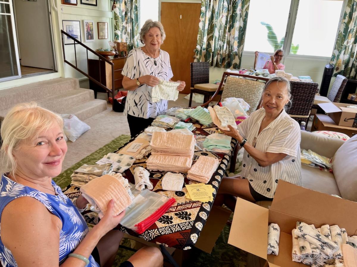 Linda McColgan started the month by hosting a Lullaby Layette packing party at her home. 190 layettes were assembled and delivered to Kaiser and Kapiolani Hospitals and Waikiki Health.