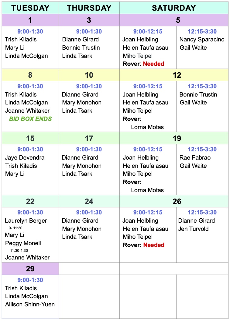 Starting at the April meeting, I will begin collecting dues at $60/yr from each member. Please bring cash or a check written out to Assistance League of Hawaii. If you use a check please write Dues 2025-2026 on the Memo line. If you don’t make the meeting, you can bring cash or check to the Thrift Shop. If I’m not there, please write your name on a piece of paper, clip it to your cash and put it in the Dues envelope in the mail folder for the Treasurer. If you have written a check, just put it in the Dues envelope in my folder. If you can’t come to a meeting or to the Thrift Shop, mail your check to: