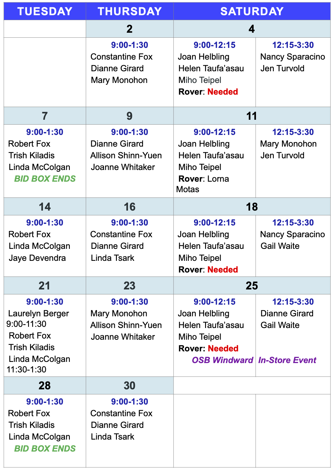Happy New Year 2025! Our chapter is starting out with a new coat of paint inside the Thrift Shop. It is Ku’ulei Pai’s vision, and the plan was executed by many hands – Jim, Nancy, Margie, Andrea and Ellen to name a few. Come check out our fresh new look.