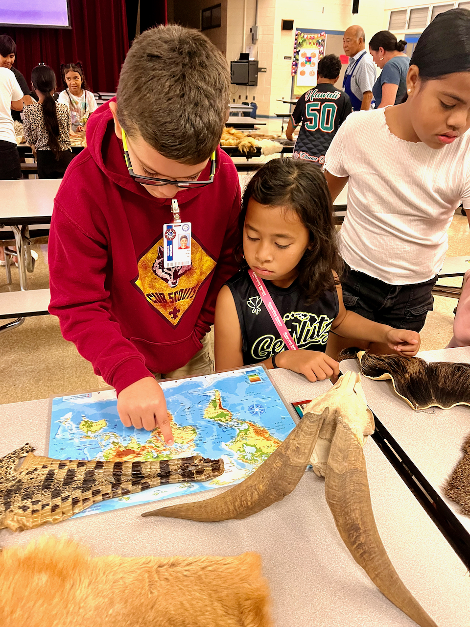 | | Fourth grade students inspect biofacts and locate the place where the wildlife came from on the map. | | | The traveling displays have a few new biofacts that do not allow students to touch the items. It can be a test of wits for them to resist the temptation to touch. | | | |