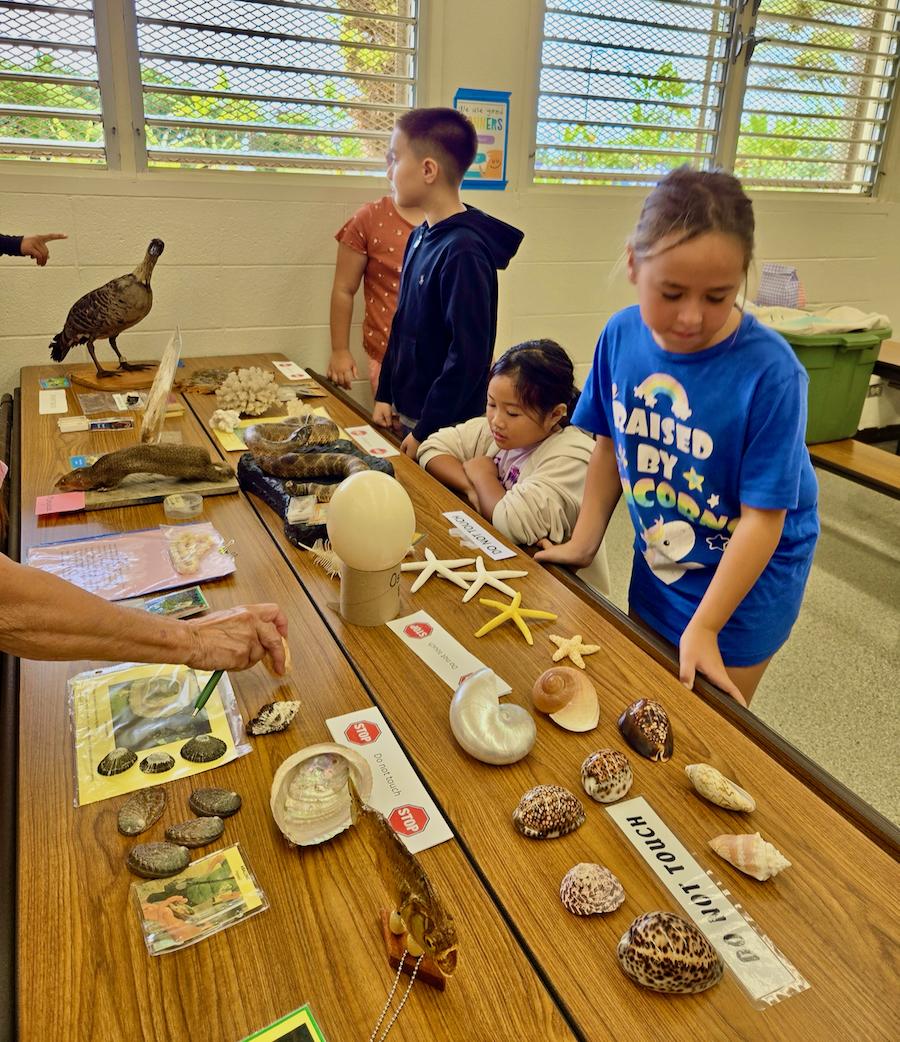| | LOOK BUT DON'T TOUCH: Our Operation Wildlife member volunteers have a new set of displays obtained from the Thrift Shop that is now part of our traveling biofacts. These 4th grade children test their temptation to "not touch" at Lanakila Elementary School. OWL volunteers go to many Hawaii schools. | | |