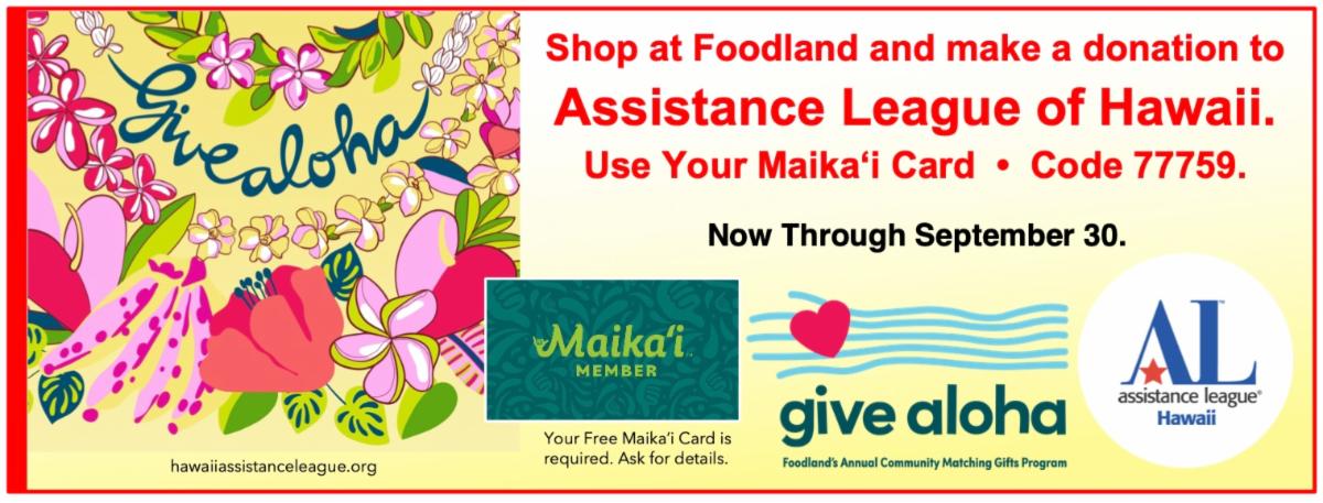From now until September 30, you can donate at any Foodland, Sack N Save, or Foodland Farms location statewide. Simply use Assistance League of Hawaii's unique code, 77759, when you check out with your Maika'i Card.