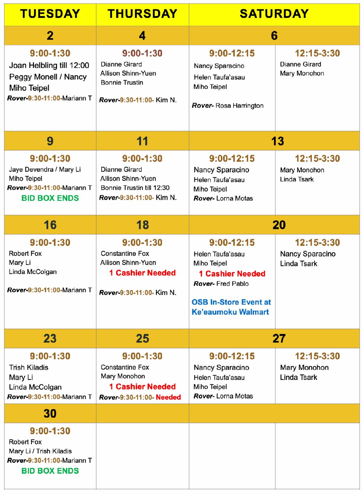 Our next in-store shopping event will be September 20th at the Honolulu Walmart again. We would love to have you join us. Please contact Mary Monohon to let her know you would love to join us. Many hands make light work.