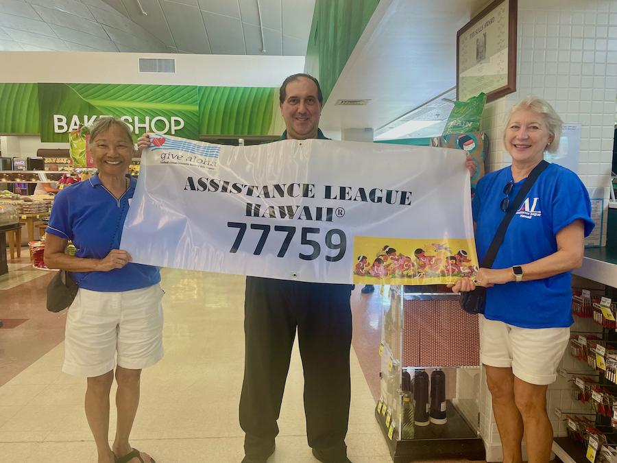 This year our Assistance League of Hawaii Give Aloha banner is on display at the Kaneohe Foodland store. The photo above features member volunteers Linda Anderson and Mary Li with Don, the Foodland Kaneohe manager.