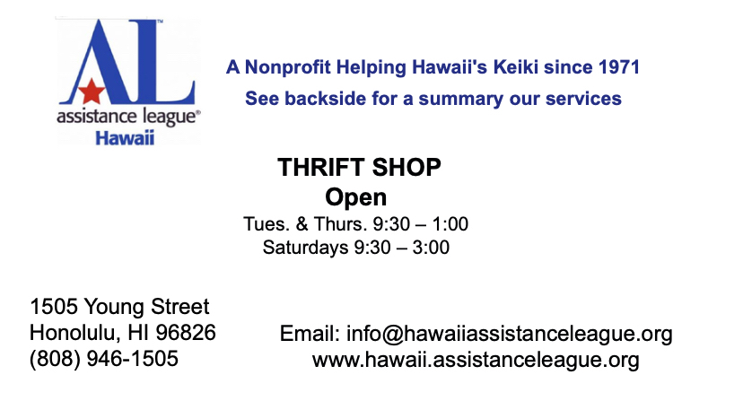 One suggestion for "getting the word out" about Assistance League of Hawaii is to be sure you always have a few business cards in your wallet, purse or pocket! When you talk to friends, family, or acquaintances about Assistance League of Hawaii, you can give them one of these cards. It is a great way to help them understand where we are, who we are, and what we do!