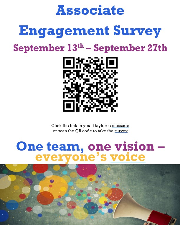 We are conducting the annual Associate Engagement Survey. Please take a few minutes to take the survey. The survey is anonymous, and we have partnered with Kincentric who will tabulate the results. We are encouraging your participation! If you have any questions, please feel free to see me in human resources.