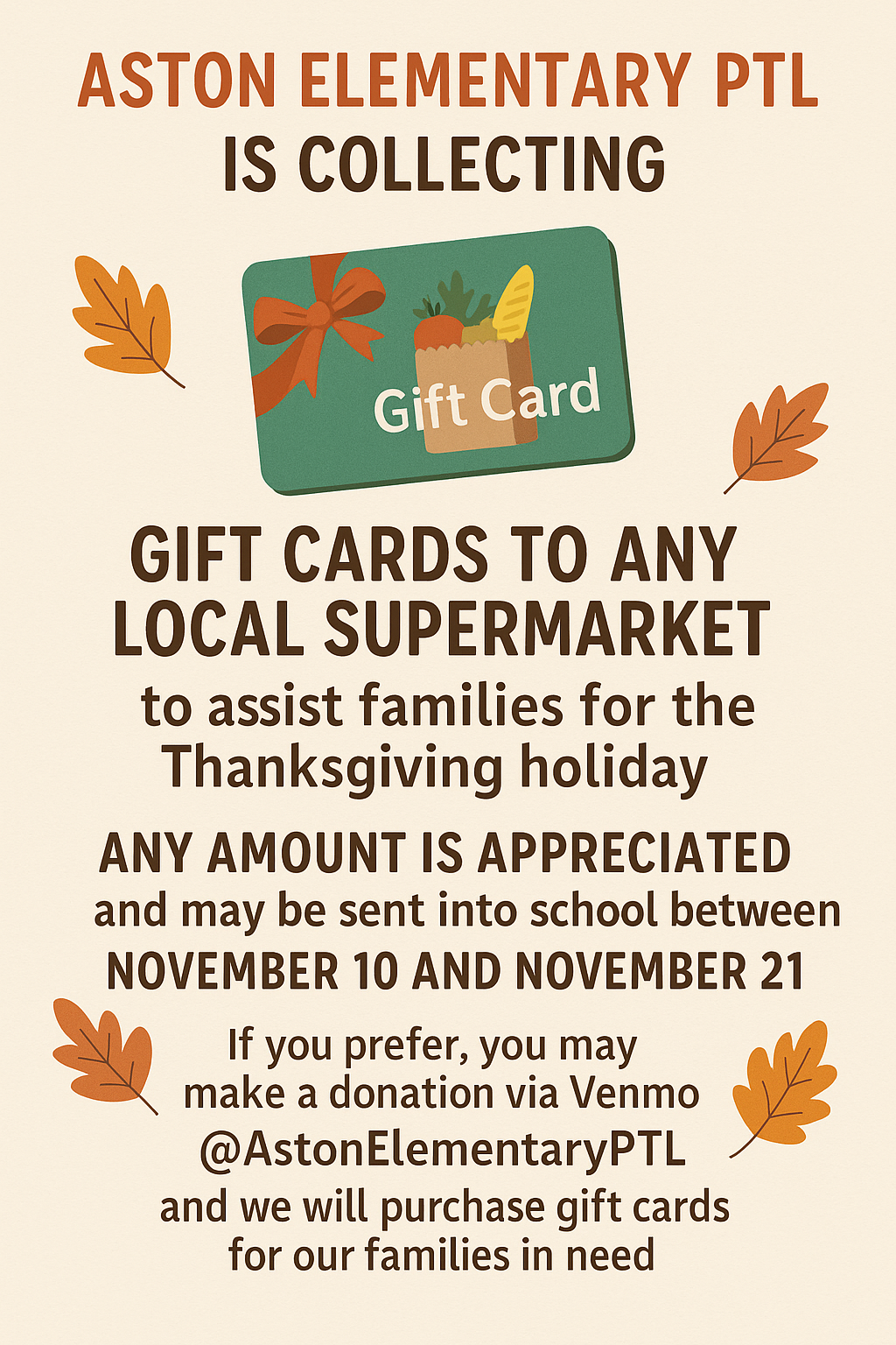 The student council is selling turkey feathers for 25 cents. The paper feathers will go on our turkeys with student names written on them. All proceeds will go to families in need at Aston Elementary.The PTL is also sponsoring a supermarket gift card drive (see below). If you have a family in need or you know a familiy in need, please let us know.