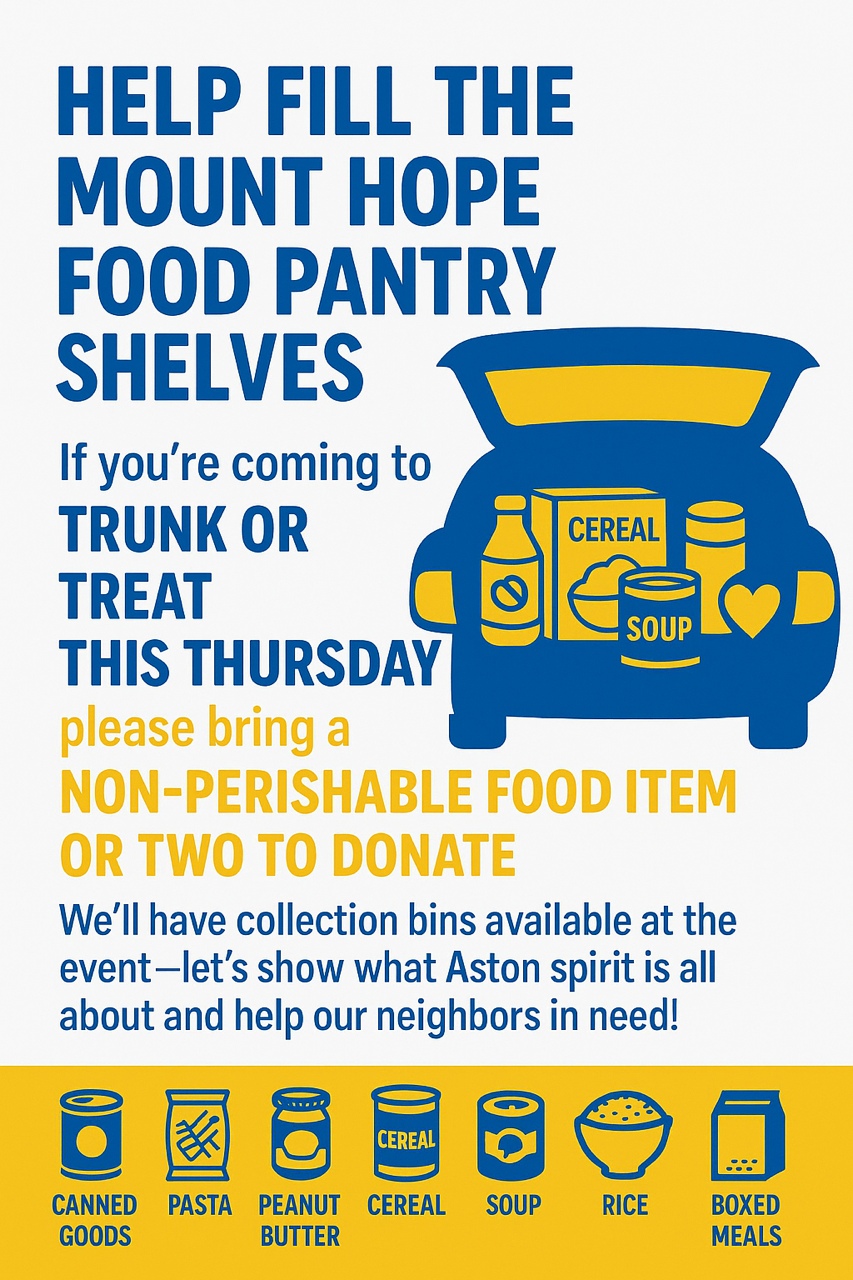 Mt. Hope is in need of non perishable food items for their food pantry. Donations will be accepted through October 31 at school or at Trunk or Treat on Thursday evening.