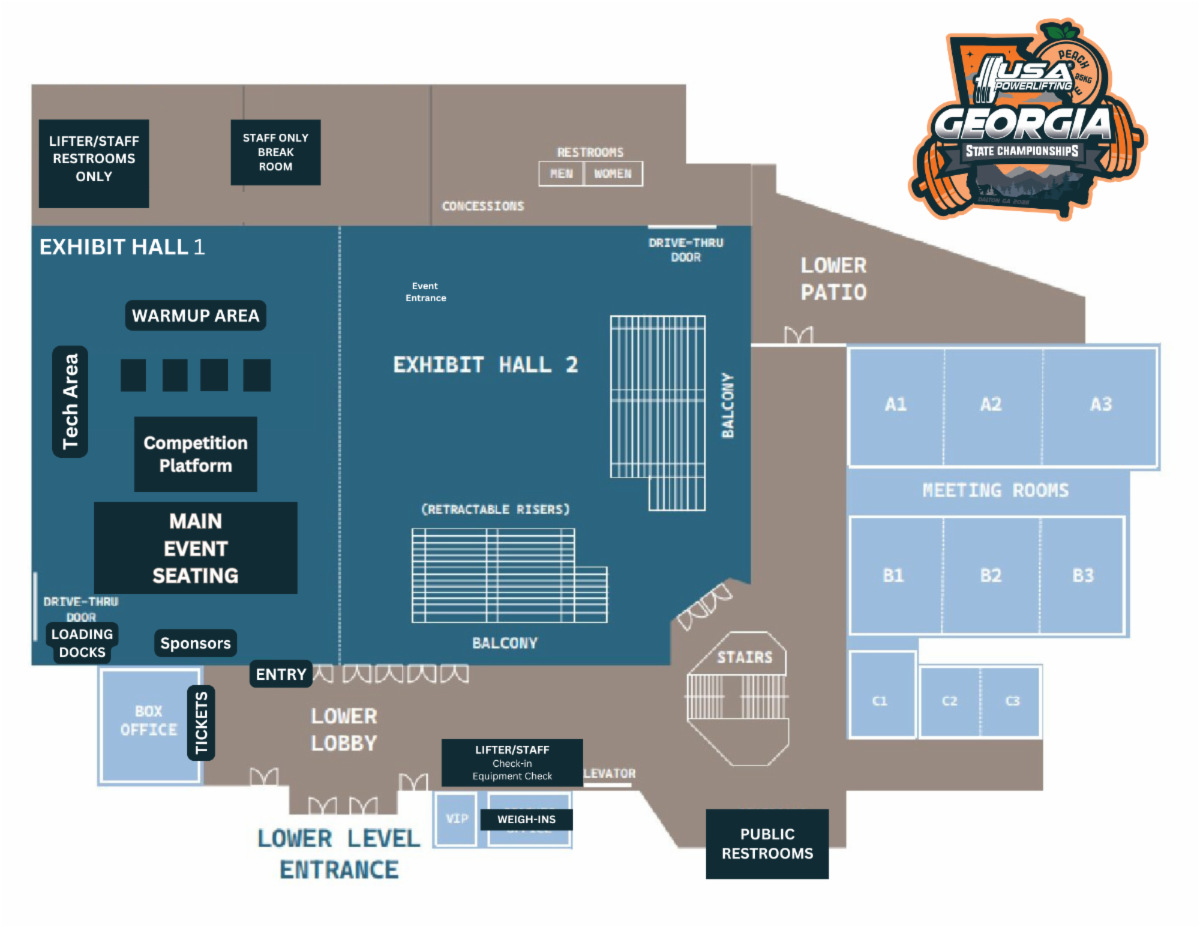 - Weigh-ins will be conducted in the Coaches Room, lower level across from Hall 1.
