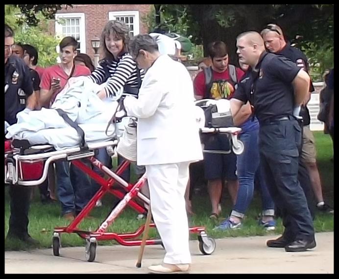 Brother Jed will pick up the story now. The attacker ran off and tossed the phone; a student recovered it and gave it to Cindy. I went over to her but she urged me to return to the preaching. A few students gathered around Cindy and attempted to minister to her. I returned momentarily to pray for her. After about 15 minutes, the police and ambulance arrived.
