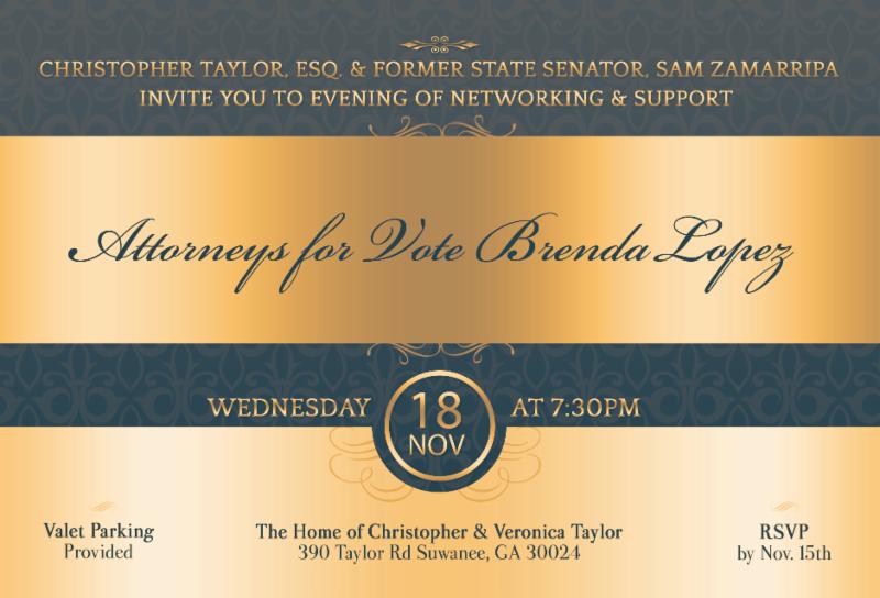 Christopher Taylor, Esq. and Former State Senator, Sam Zamarripa invite you to evening of networking and support for fellow attorney and candidate to State House District 99, Brenda Lopez, Esq. - Endorsed by Georgia's WIN List Hosted at the beautiful home of Christopher & Veronica Taylor. Enjoy an evening of great food, drinks, live entertainment and camaraderie with fellow attorneys.