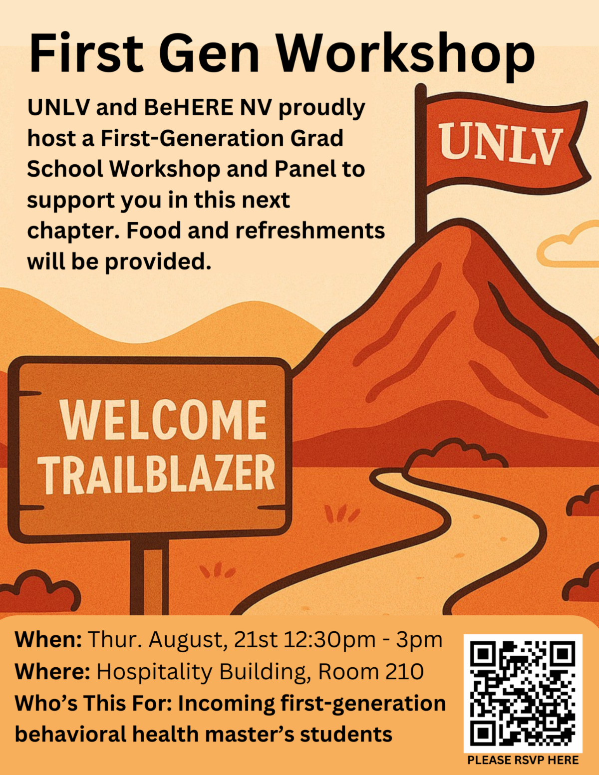 | | 🚨 FIRST-GENERATION Grad School Workshop !!🚨 | | Are you planning to begin your Master's Degree journey at UNLV this Fall (in a Behavioral Health-related program)? Do you also identify as "First-Gen?" If so, please come to our First Gen Bootcamp, scheduled on campus on August 23rd from 12:30-3:00 pm. We will have information sessions, professional panels, connecting activities, and refreshments! Please feel free to share with those who might be able to benefit from this inaugural event! | | The Child & Adolescent Psychiatry Fellowship program at the Kirk Kerkorian School of Medicine at UNLV is excited to feature Dr. Thomas Phelan, creator of the popular 1-2-3 Magic Method—a simple, effective way to help parents and caregivers manage children’s behavior without yelling or arguing. Used by millions worldwide, his approach breaks discipline into three easy steps that really work. | | Become an Approved Supervisor for Nevada CPC & MFT Interns | | |
