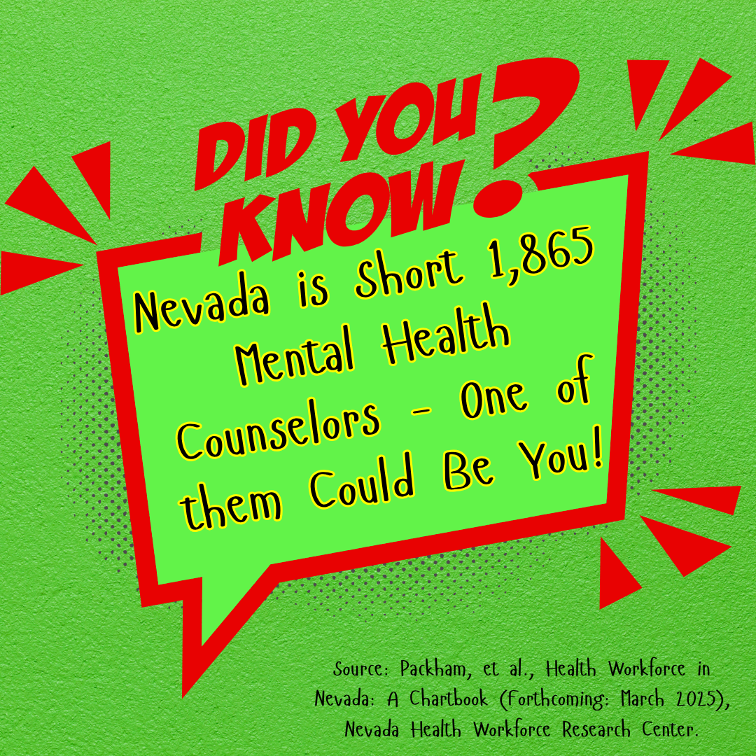 The Behavioral Health Education, Retention, and Expansion Network of Nevada (BeHERE NV) is a new workforce development initiative to increase the number of providers of behavioral health care in Nevada. In 2023, the Nevada Legislature unanimously passed Assembly Bill 37 to create a statewide behavioral health workforce development center within the Nevada System of Higher Education (NSHE). In September 2023, the NSHE Board of Regents designated the University of Nevada Las Vegas (UNLV) to serve as the administrative hub for BeHERE NV and to build connections across the state. | | | |