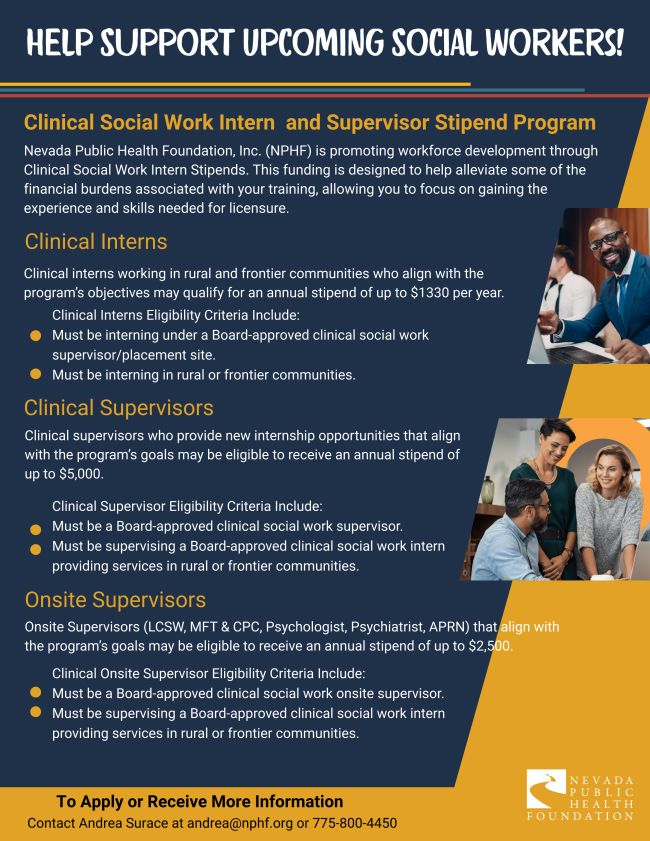 Nevada Public Health Foundation, Inc. (NPHF) is a statewide non-profit that collaborates with public health stakeholders to address the needs of communities and agencies that can benefit from additional resources, service modification, and modeling. NPHF is promoting workforce development and employee retention through the Social Work Workforce Development (SWWD) Scholarship Initiative, which is designed to assist social work students who are currently engaged with the Nevada Department of Health and Human Services as employees, contractors, interns, practicum students, or volunteers. The SWWD Scholarship dashboard profiles the characteristics of scholarship awardees within the Nevada Department of Health and Human Services. For more information about NPHF's work to support the Social Work workforce in Nevada, contact Andrea Surace, Workforce Development Coordinator, at Andrea@nphf.org